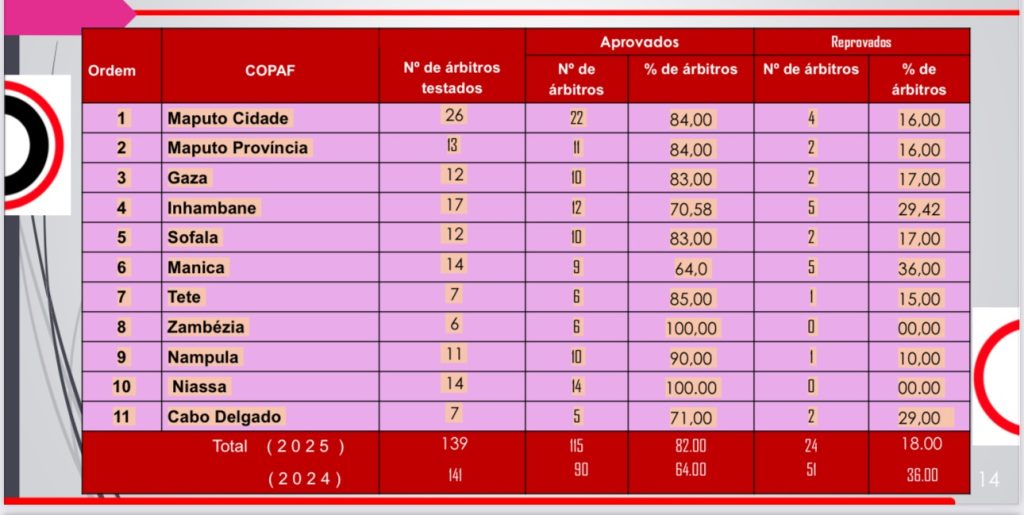 Refira-se que, para a temporada futebolística de 2025, a CNAF testou um total de 139 árbitros, tendo reprovado 24, contra 51 do ano passado. Entre os chumbados brilha com luz própria o nome de Ema Novo, a melhor juíza da última edição do Moçambola.