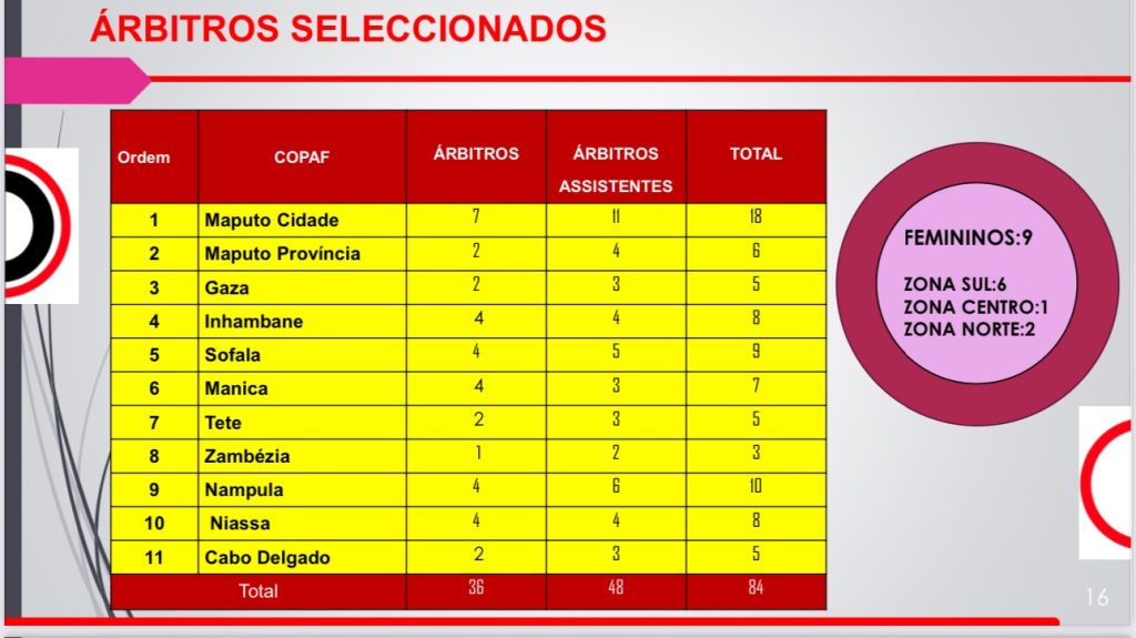 Destes 84 juízes, 36 são árbitros centrais e 48 assistentes. Merecedor de destaque é o facto de no agregado nove serem do sexo feminino.