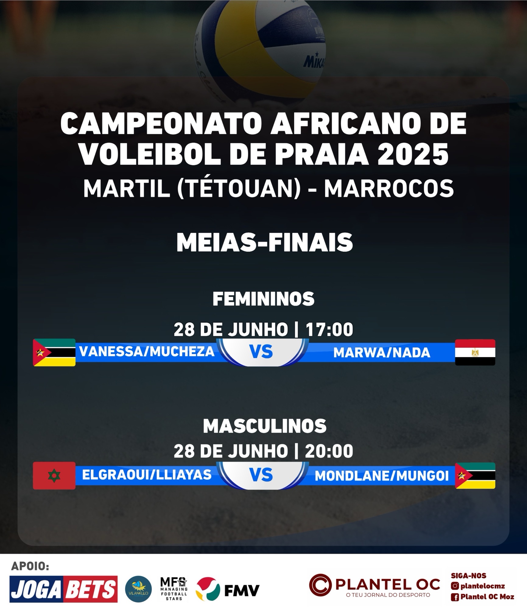 Vanessa Muianga e Mércia Mucheza fizeram-no depois de derrubarem a dura dupla marroquina constituída por Zeroual e Yakki. Por 2-1 nos sets, com parciais de 21-17, 17-21 e 15-12.