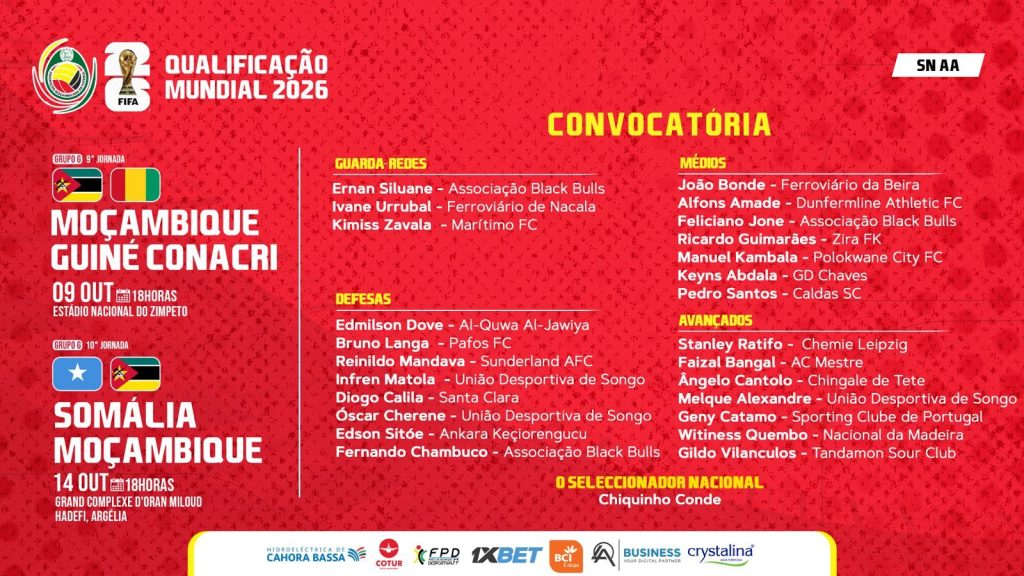 O seleccionador nacional de futebol, Chiquinho Conde, divulgou esta quarta-feira, 30 de Setembro, a convocatória final dos Mambas, para os desafios frente a República da Guiné frente à Guiné e à Somália, marcados para os dias 9 e 14 de Outubro, no âmbito das eliminatórias africanas de acesso ao Mundial FIFA 2026.