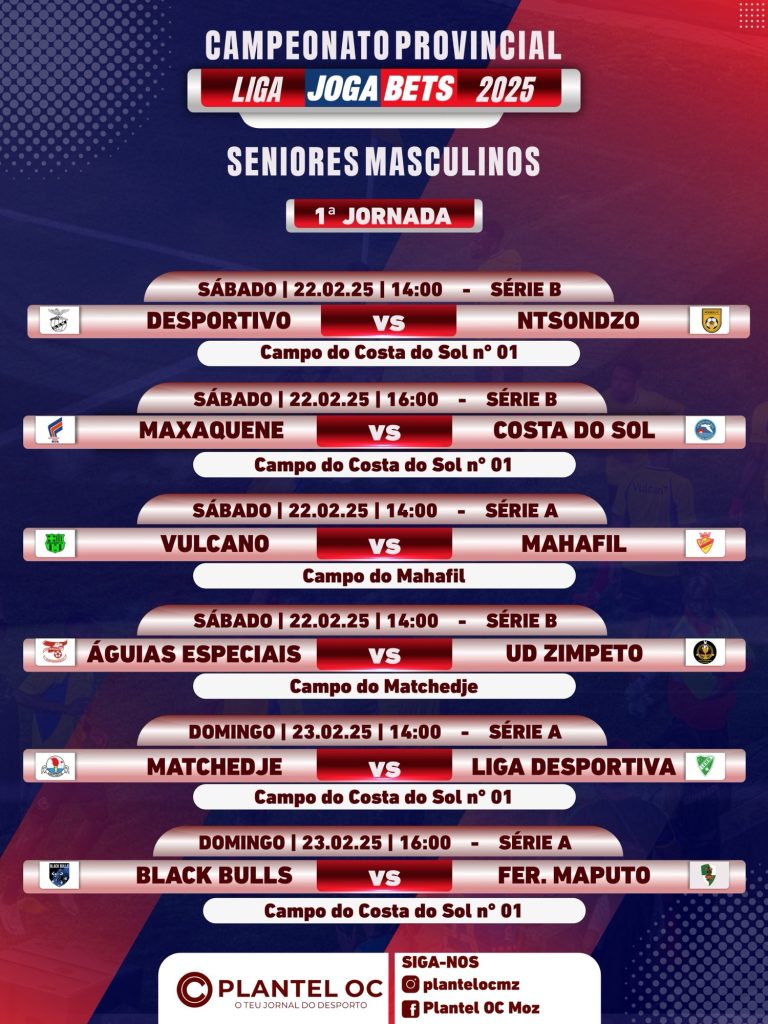 Ainda para a série B, as Águias Especiais recebem a UD Zimpeto, a passo que o Mahafil será uma espécie de anfitrião visitante contra o Vulcano, já para a Série A. Os dois encontros serão também disputados no sábado (22).