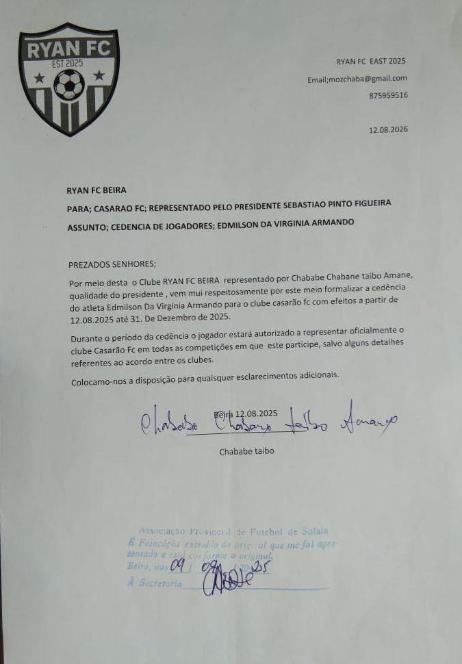 Com o caso desde 08 de Outubro último, o Conselho de Disciplina (CD) da Associação Provincial de Futebol de Sofala (APFS) terá apenas notificado, por escrito, o Estrela Vermelha, de modo a que este clube pudesse explicar os termos da inscrição do atleta Edmilson Vieira que, de acordo com os documentos na posse de Plantel OC, a 12 de Agosto foi cedido por empréstimo válido até 31 de Dezembro pelo Ryan da Beira ao Casarão Team.