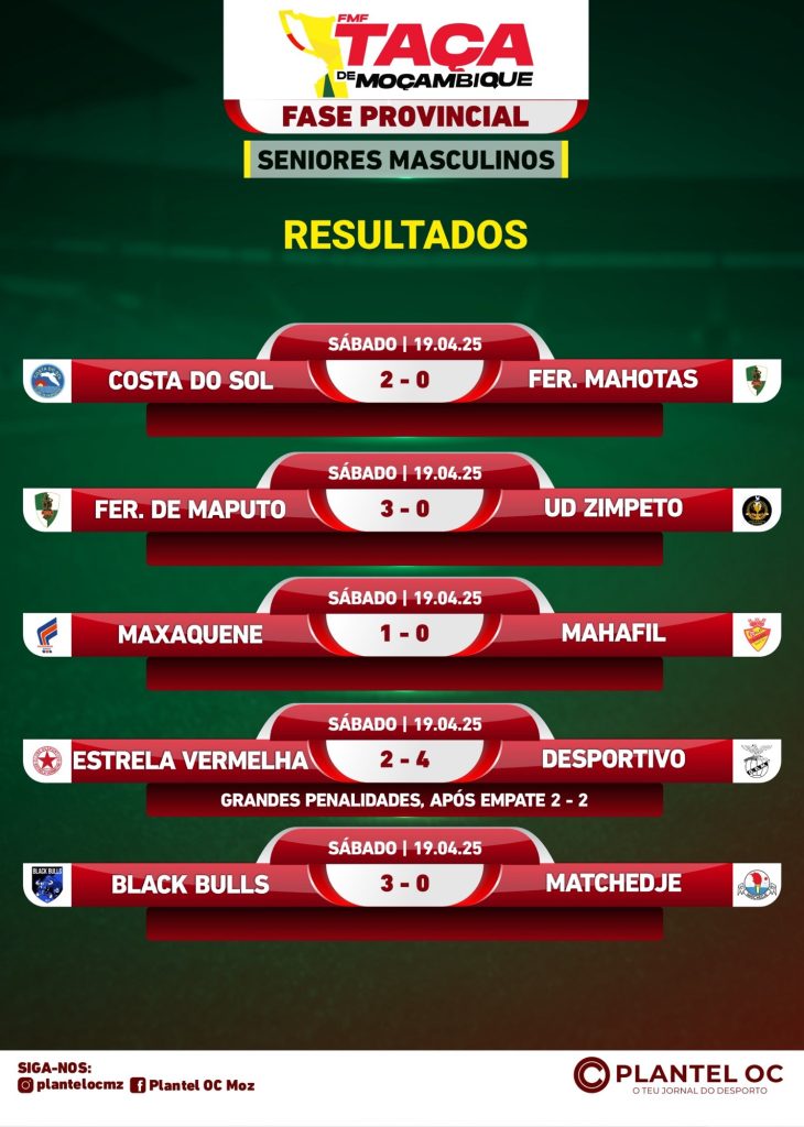 Não houve surpresas na segunda e última eliminatória da Taça de Moçambique a nível da Cidade de Maputo. Ferroviário de Maputo, Black Bulls, Costa do Sol, Maxaquene e Desportivo seguem para a fase nacional.