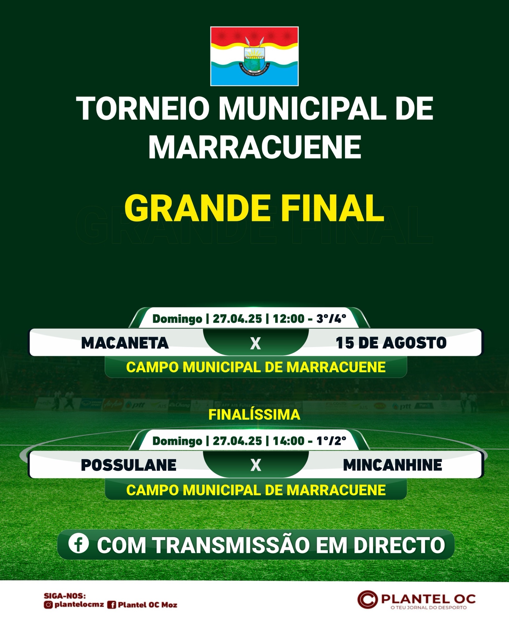 As equipas de Possulane e de Minkanhine disputam a final da milionária prova dos 20 bairros municipais este domingo, a partir das 14 horas, no campo da Vila-Sede. A festa da final será transmitida em directo e por streaming pelo Plantel OC.