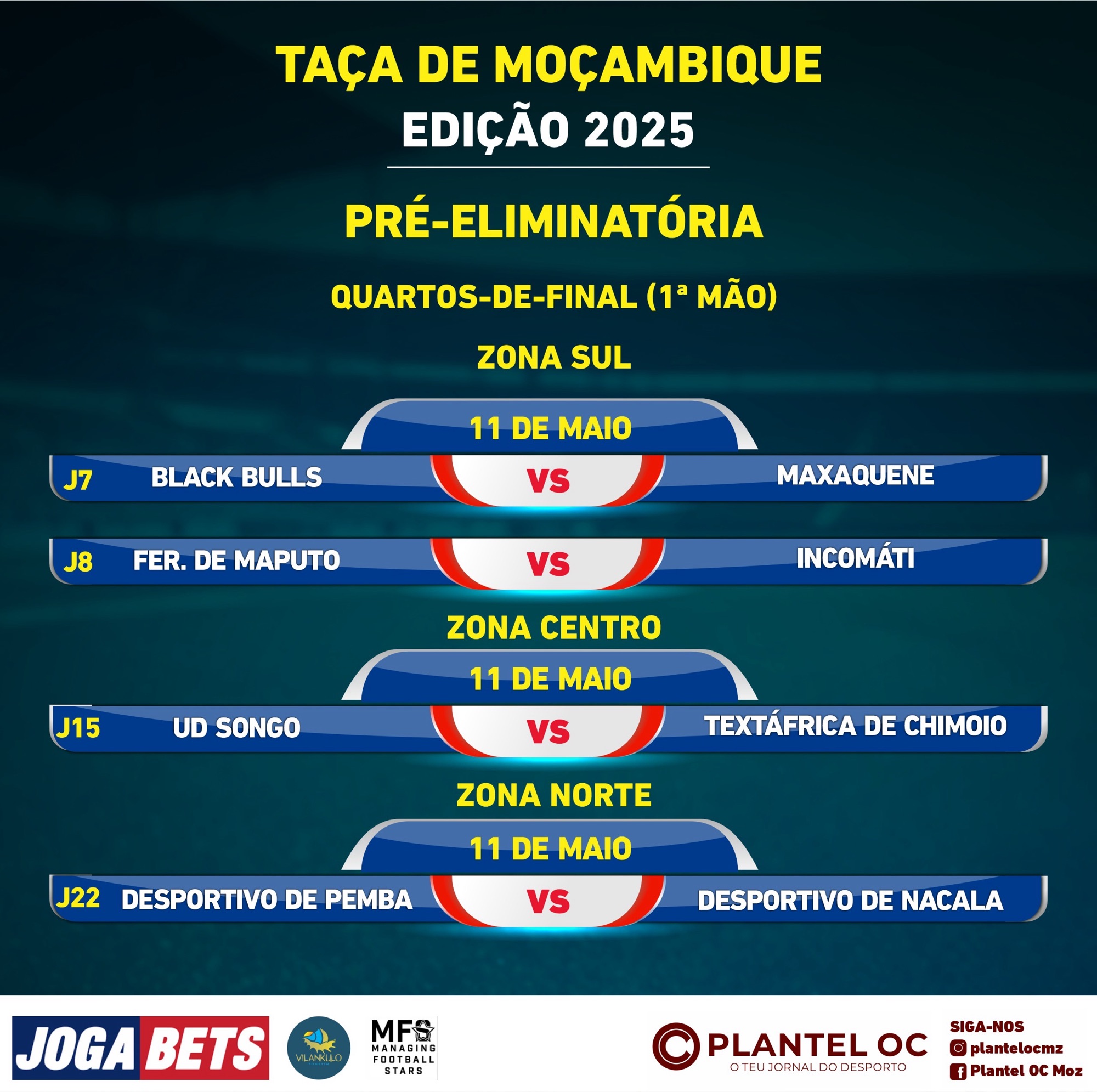 Refira-se que os quartos-de-final da Taça de Moçambique serão disputados a duas mãos. A primeira está marcada para o próximo fim-de-semana e a segunda em data ainda por anunciar, visto ser expectável que o Moçambola arranque a 17 de Maio. [PLANTEL OC]